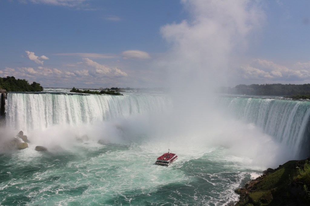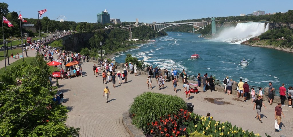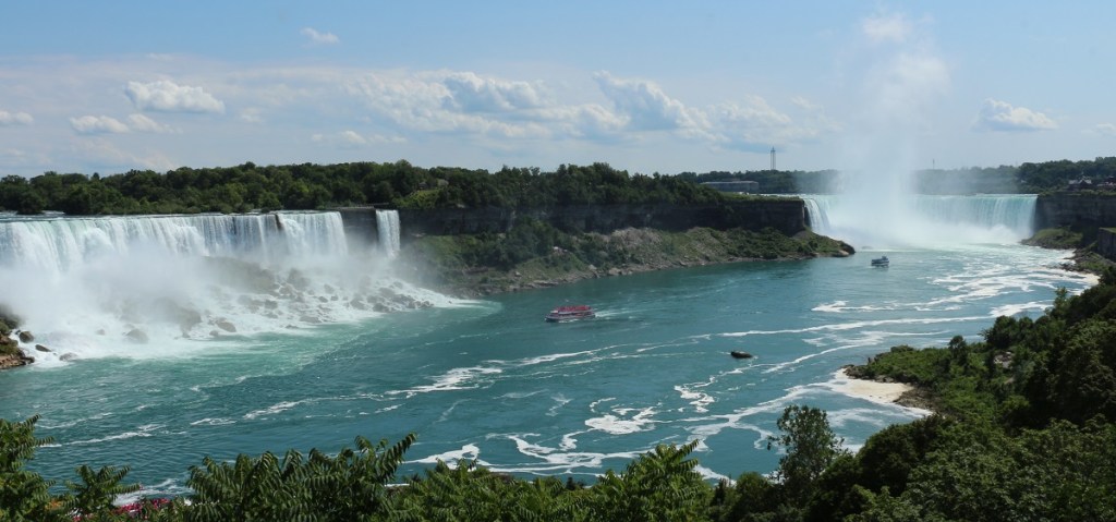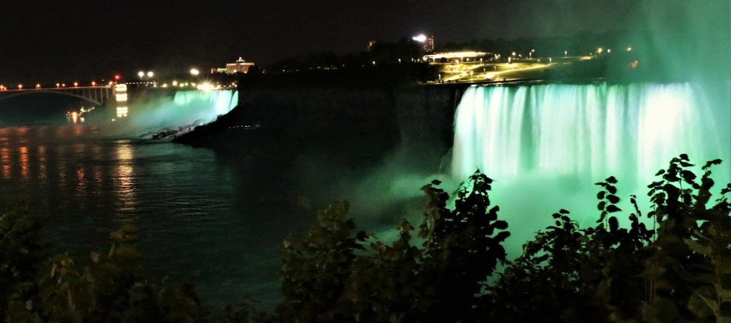 El rio niagara separa estos 2 países y genera este bello espectáculo de cataratas con una caida superior a los 65 mts de altura, se siente el poder y el espectáculo está muy bien montado de día y de noche.