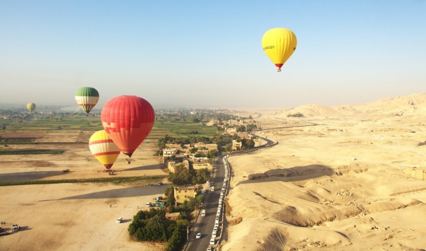 Pasamos una noche deliciosa en la cubierta del Barco sobre el Rio Nilo, el siguiente día sería muy largo, pues estaba en el programa disfrutar el amanecer en Luxor volando en un globo aeroestático, son muchísimos globos, diría que eran cerca de 100, es un paseo turístico obligado, pues es maravilloso, cuando los primeros tonos anaranjados y azules comenzaron a iluminar las montañas de la antigua Tebas, iniciábamos nuestro paseo en globo sobre Luxor, es un vuelo delicioso y tranquilo de aprox. 1 hora por la orilla occidental del río Nilo, impulsados por un viento fresco pero ligero, divisábamos desde una posición privilegiada los templos funerarios de Hatshepsut, el Ramesseum o Medinet Habu y, las tumbas que agujerean el conocido Valle de los Reyes, entre otros muchos sitios arqueológicos.