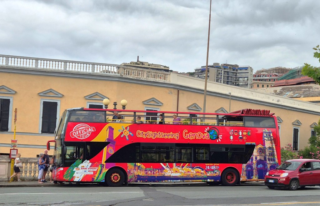 La mejor forma de conocer la ciudad en 1 día es comprar un tiquete para montarse al autobús turístico (El City sightseeing Genova), el valor es de euros$35 x persona, no es barato, pero vale la pena, tiene 11 paradas y uno se puede bajar y montar en cualquiera durante 12 horas. Es un bus de 2 pisos con techo descapotable muy práctico y bonito, perfecto para recorrer la ciudad.